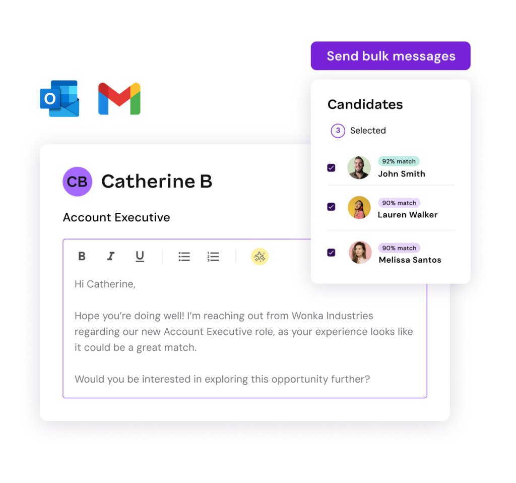 Keep candidates in the loop at each stage of the hiring process with bulk email features, automations, and direct messaging. Integrate your email and calendar to make communication even easier.