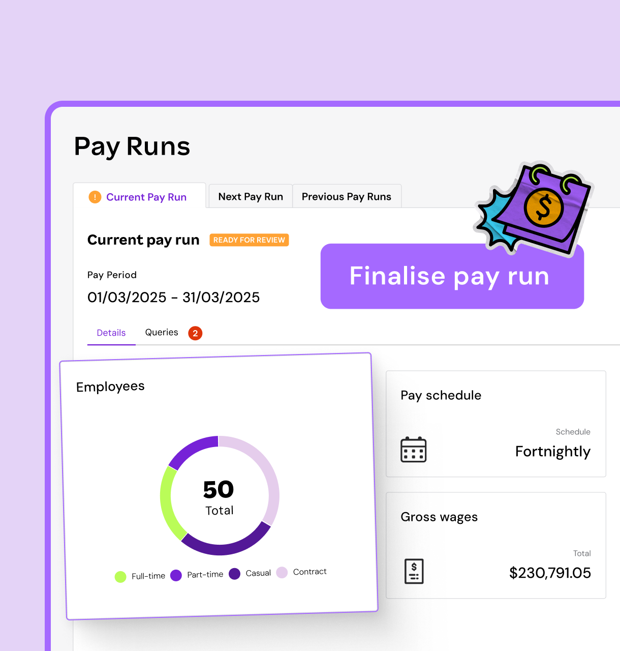 Our intelligent automated payroll software does the heavy lifting for you. It compiles all the data you need for a pay run, flagging any anomalies before they become problems. You can review, approve, and process payroll in minutes, not days.
